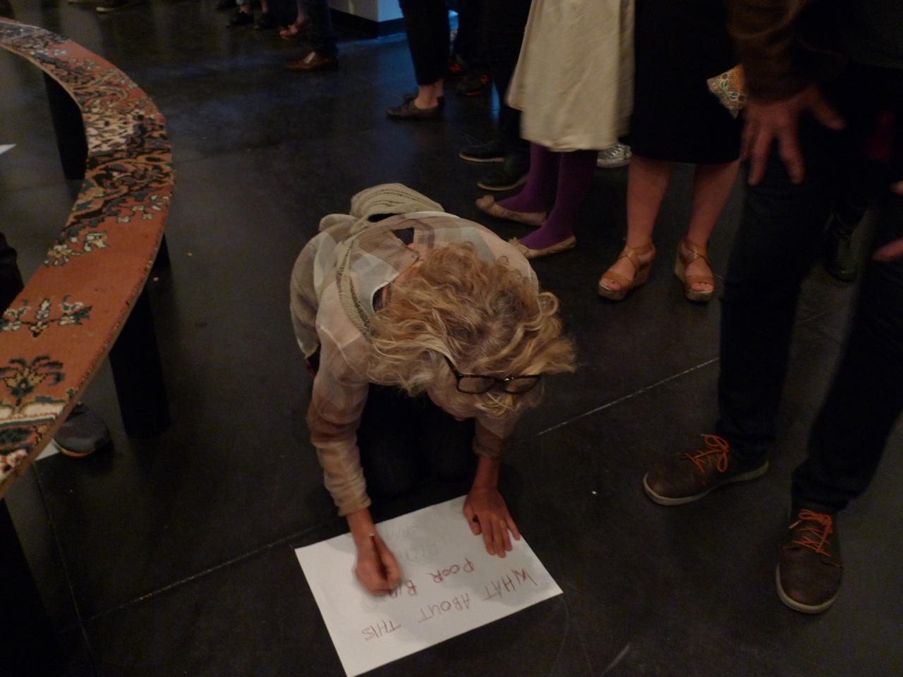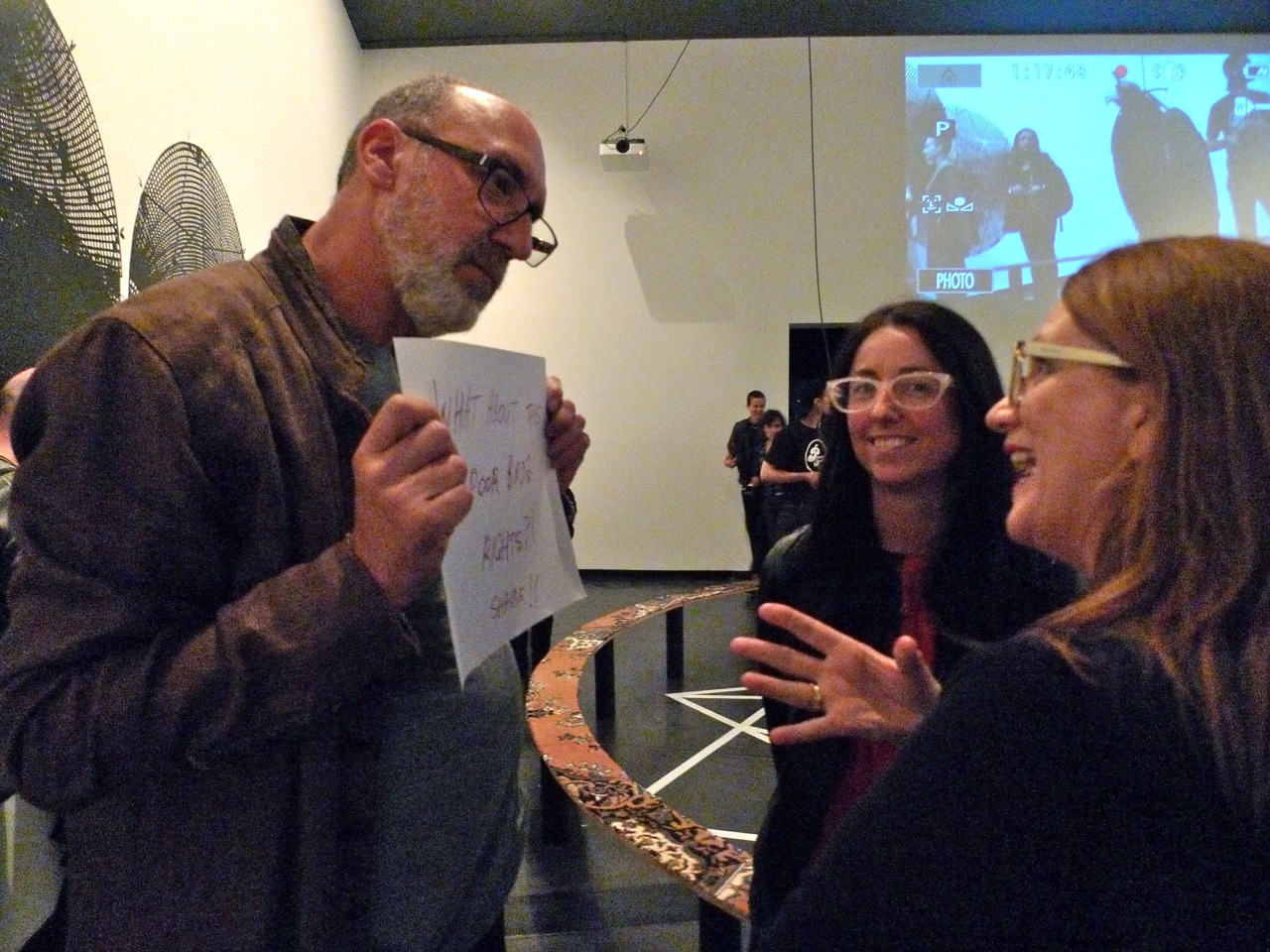 Galleryist Helen Gory and husband Melbourne Art Collector Gadi Kolsky were so outraged that the RSPCA hadn’t been informed of the Falcon’s hooded performance, they turned into impromptu activists on the spot. A hasty sign was produced and they picketed the performance, adding new dialogues to the circle of bird art (see photographic evidence).
