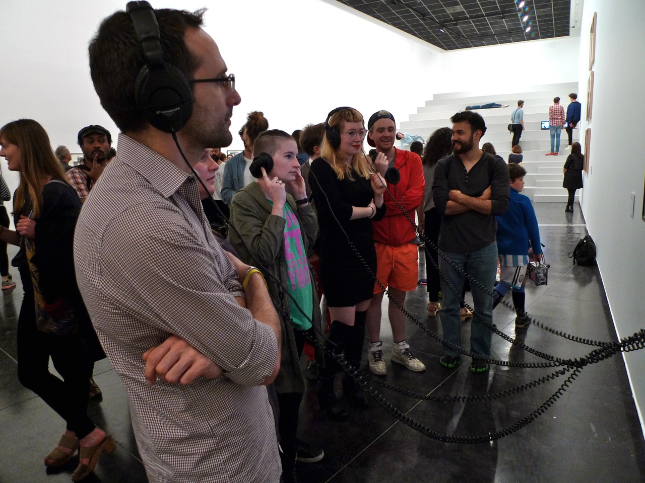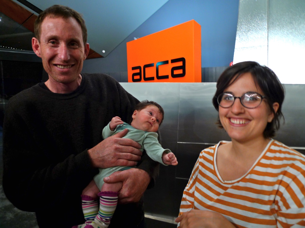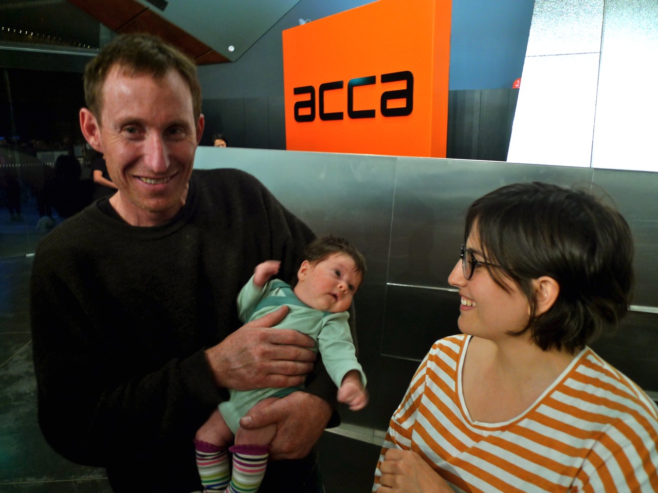 The Melbourne Festival Show at ACCA Framed Movements, curated by Hannah Matthews, opened on Thursday night. Lane Cormick presented a startling new work from the ‘Is it Art or is it Animal Cruelty’ genre, involving a live falcon, hood, perch, a circle of onlookers and witchypoo masking tape stuck to the ground. The crowd seemed somewhat divided on the issue.