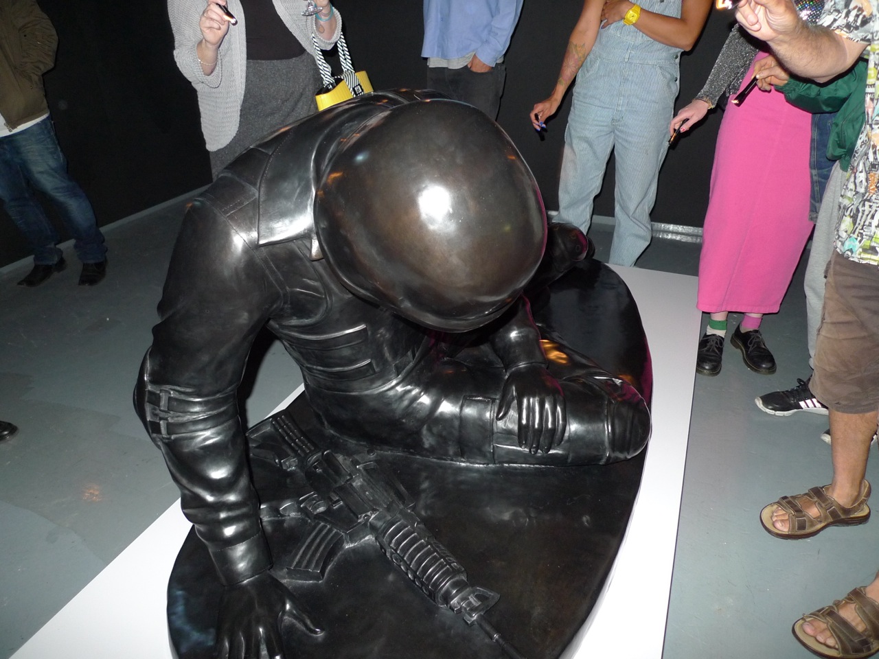 The world’s political landscape right now is so munted that some artists are really getting angry and it’s coming out in their work. As Penny Byrne began addressing the audience that had gathered for the unveiling of her latest show Etonnez-moi at Fehily Contemporary, a Police siren sounded, as if on cue. It added a certain something to an excellent, thought provoking show that’s all about riots. There’s a life-sized bronze riot policeman, ’felled’ (2014), a 24-carat gold gilded porcelain Weapon of Mass Destruction (2014) and a video of a foreign news broadcast that screened footage of a heavy handed state response to a street gathering or protest. It rapidly descended into a riot.