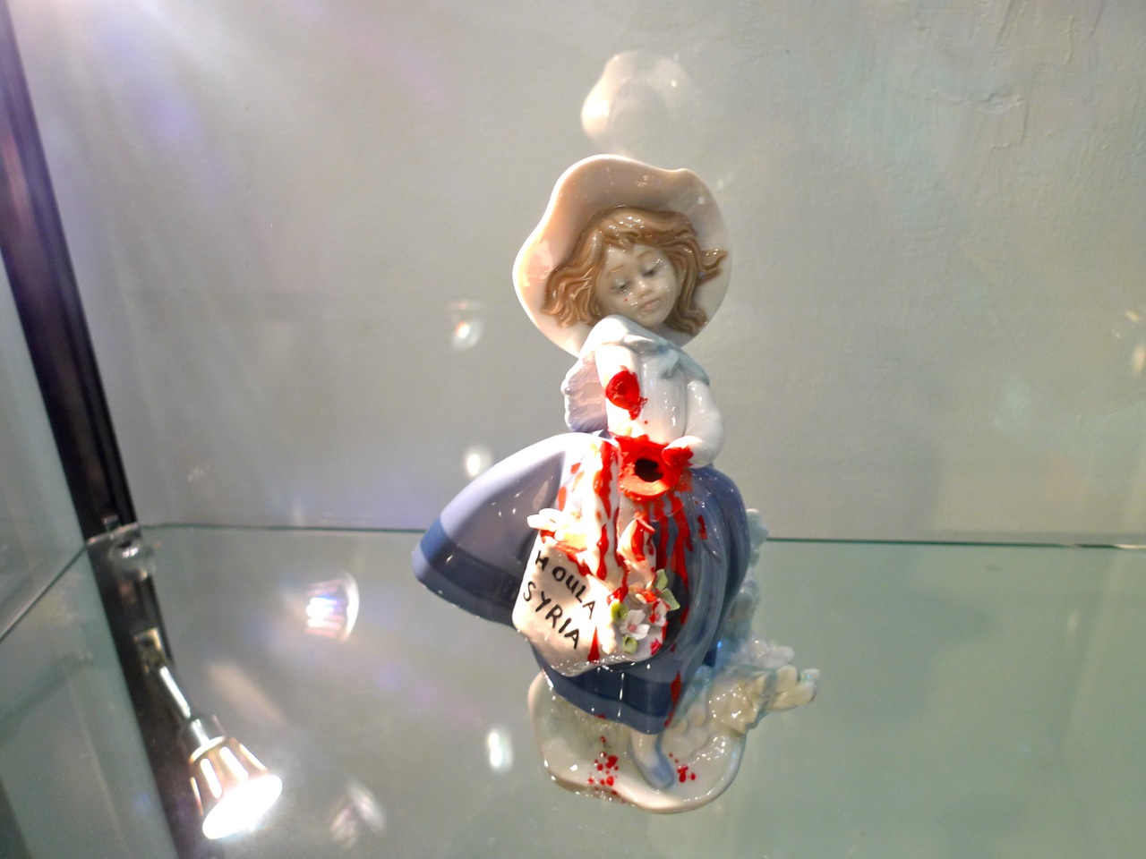 In a cabinet in the gallery foyer were 3 works from the iProtest series (exhibited at Melbourne Now NGV). Here, Penny travels to world hot spots of war, carnage and protest. There’s a plethora of choices and she reminds us, perhaps through the removal of an arm from a vintage ceramic figurine and the addition of dripping blood red enamel red paint, of what is happening to people caught in the wrong place at the wrong time. Without the resources to relocate to a less war torn area, find a house, a job, schools for the kids and safety from death.