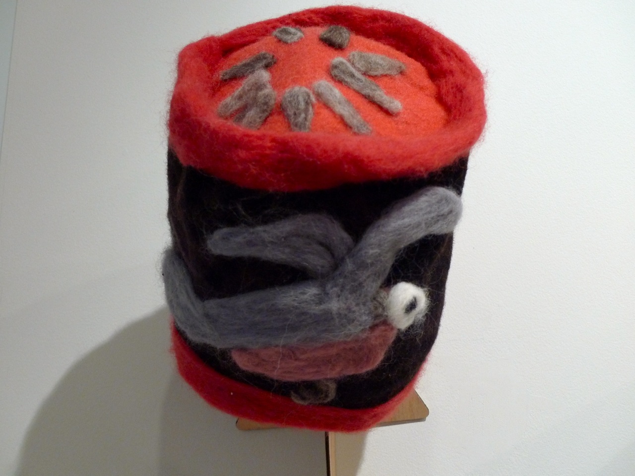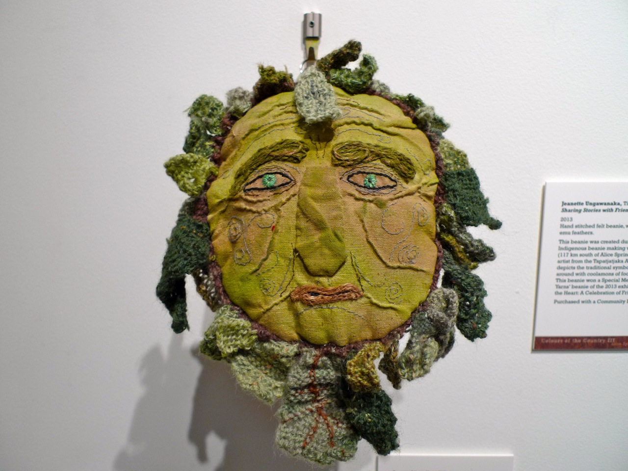 The Colours of the Country III project fits in remarkably well with what constitutes a good life. This collection of works has been lovingly produced by women from communities throughout Australia, but particularly (following a series of making workshops) the Central Desert region. The beanies that you’ll enjoy seeing upstairs haven’t been made to a pattern. The makers’ skills are such, that they can make up their own set of rules and what I see is a clear sharing of techniques involved in the making of these works. I see humour, wit and whimsy, and a fantastic observation of the local flora and fauna of the areas in which the artists live and work. I imagine the congregations of these artists coming together to knit, to sew, and to felt, talk, gossip and share stories and support each other. Building relationships through art.