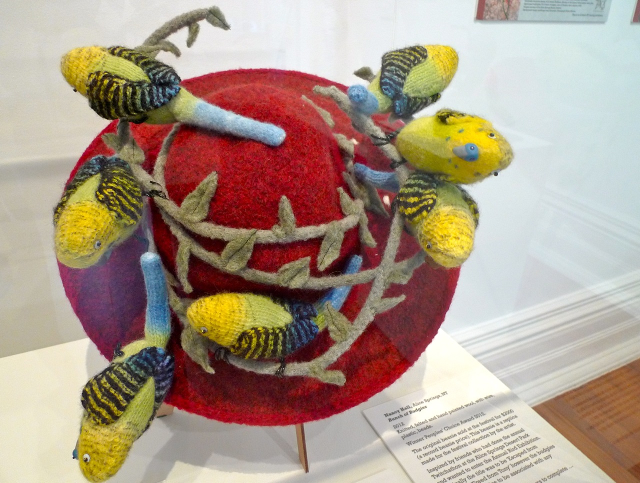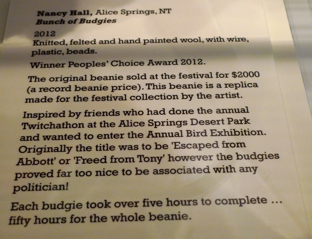 I wouldn’t call the Beanies now on show at the Bundoora Homestead, so much beanies. I would call them hand crafted unique pieces of wearable art. Of Museum Quality. Made with love, with wit and with considerable understanding of the 3 dimensional form. And how it can be safely and comfortably affixed to ones head. Preferably without pins.