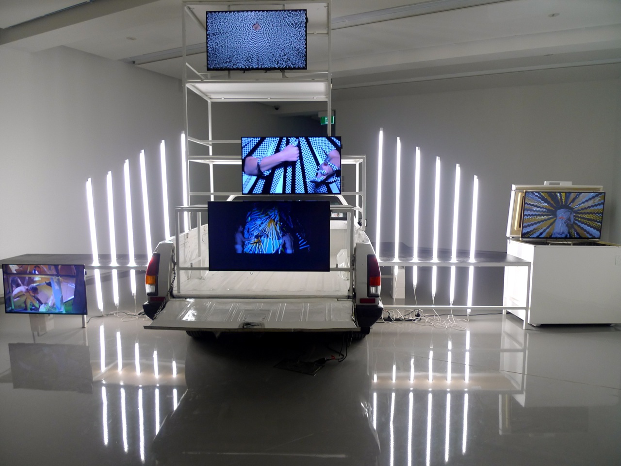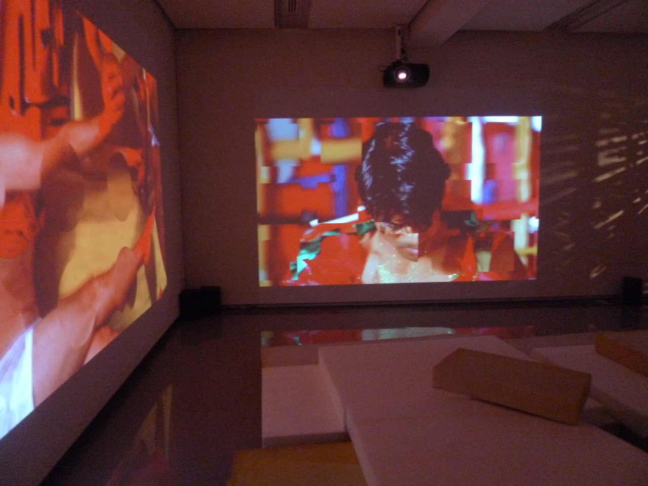 Within the fine confessional/self help tradition of much feminist work, Sydney based artist Justene Williams stares down the demise of a relationship and uses it to her advantage. She unleashes a torrent of mayhem and frustration, the theatrical overtures of which spilled out into real life at the opening on Saturday arvo. The art is large video installations, a lot of dressing up and masking, a fluorescent and dense palette pimping up surrealist play. Acting out and acting up. Everyone’s onstage and I’m not sure who the Director is. Or even if there is one.